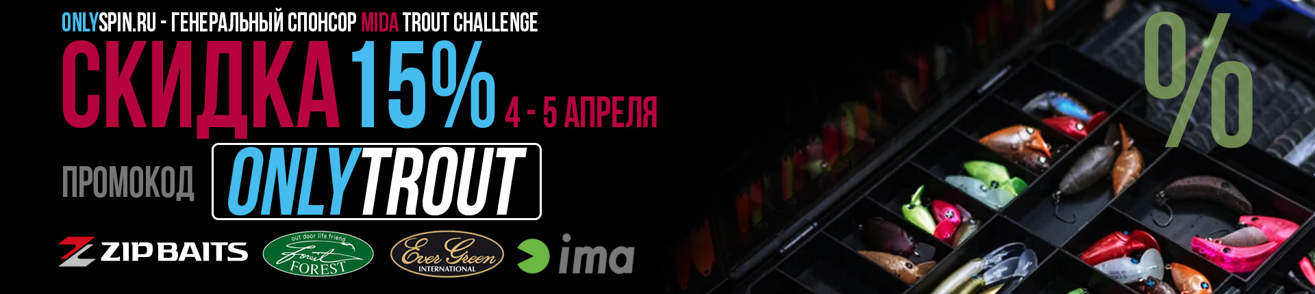 Генеральный спонсор MIDA TROUT CHALLENGE 2026 дарит скидку 15% на бренды Forest, Evergreen, ZipBaits и Ima! Только с 4 и 5 апреля используйте промо-код ONLYTROUT на сайте OnlySpin.ru.